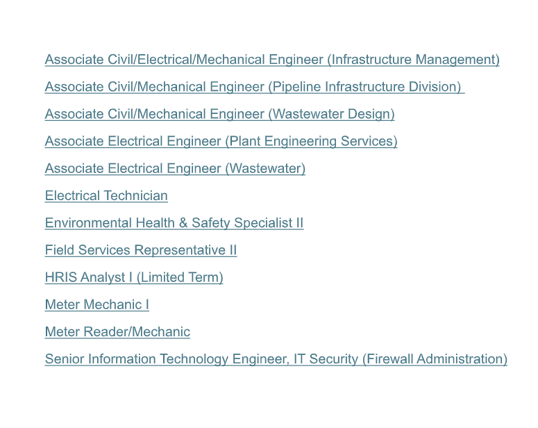 관련 커리어 토목 엔지니어 전기 엔지니어 전기 유틸리티 도우미 전기 기술자 환경 보건 및 안전 책임자 정보 보안 분석가 기계 엔지니어 대상 성별 남성 여성 기타 관련 산업 컴퓨터 및 정보 기술 건설 및 숙련된 무역 환경 정부, 비영리 및 공공 서비스 인프라 타겟 대도시 지역 샌프란시스코-오클랜드-헤이워드, 캘리포니아주 타겟 고객 유형 학교 카운슬러 고등학생 중학생 부모 교사 기타 설명(선택 사항) 아래에서 현재 채용 공고를 확인하세요:• 준토목/전기/기계 엔지니어 (인프라 관리)• 준토목/기계 엔지니어 (파이프라인 인프라 부문)• 준 토목/기계 엔지니어 (폐수 설계)• 준 전기 엔지니어 (플랜트 엔지니어링 서비스)• 준 전기 엔지니어 (폐수)• 전기 기술자• 환경 보건 및 안전 전문가 II• 현장 서비스 담당자 II• HRIS 분석가 I (기간제)• 계량기 정비사 I• 계량기 검침원/정비사• 선임 정보 기술 엔지니어, IT 보안 (방화벽 관리) 썸네일(선택 사항) 성격 창조자 빌더 주최자 사람 사람 설득자 문제 해결사 관련 하위 도메인 베이아레아 작성자 EBMUD
